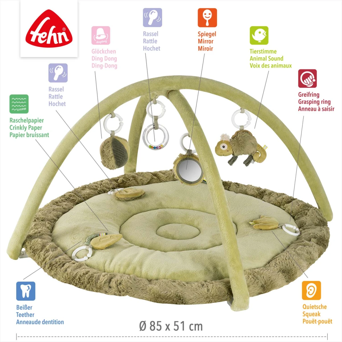 Fehn je německá společnost specializující se na výrobu vysoce kvalitních hraček a doplňků pro kojence a batolata. Od svého založení v roce 1949 se zaměřuje na inovativní produkty, které podporují vývoj dítěte a splňují nejvyšší standardy kvality a bezpečnosti. Sortiment společnosti Fehn zahrnuje širokou škálu produktů, jako jsou hudební kolotoče, 3D deky, aktivity hračky, plyšové hračky, muchláčky, látkové knížky, chrastítka, spirály, hračky do vody a mnoho dalších. Tyto výrobky jsou navrženy s důrazem na detail a vyrobeny z bezpečných materiálů, aby nejen bavily, ale také podporovaly motorický, smyslový a kognitivní rozvoj dítěte.