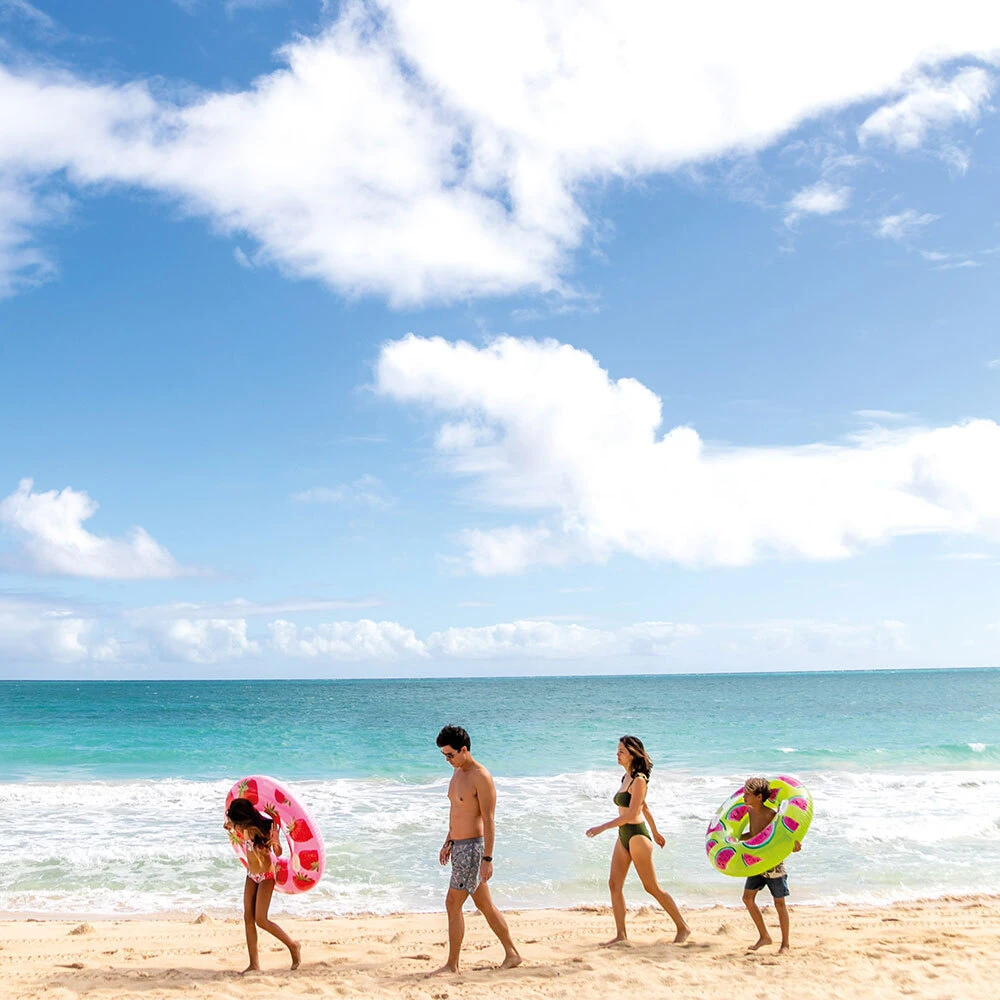 Na výběr jsou oblíbené motivy ananasu, melounu nebo jahody, které díky výrazným barvám a detailnímu zpracování okamžitě zaujmou. Kruh je vybaven dvěma pevnými madly, která zajišťují lepší stabilitu a pohodlné držení při plavání i odpočinku.