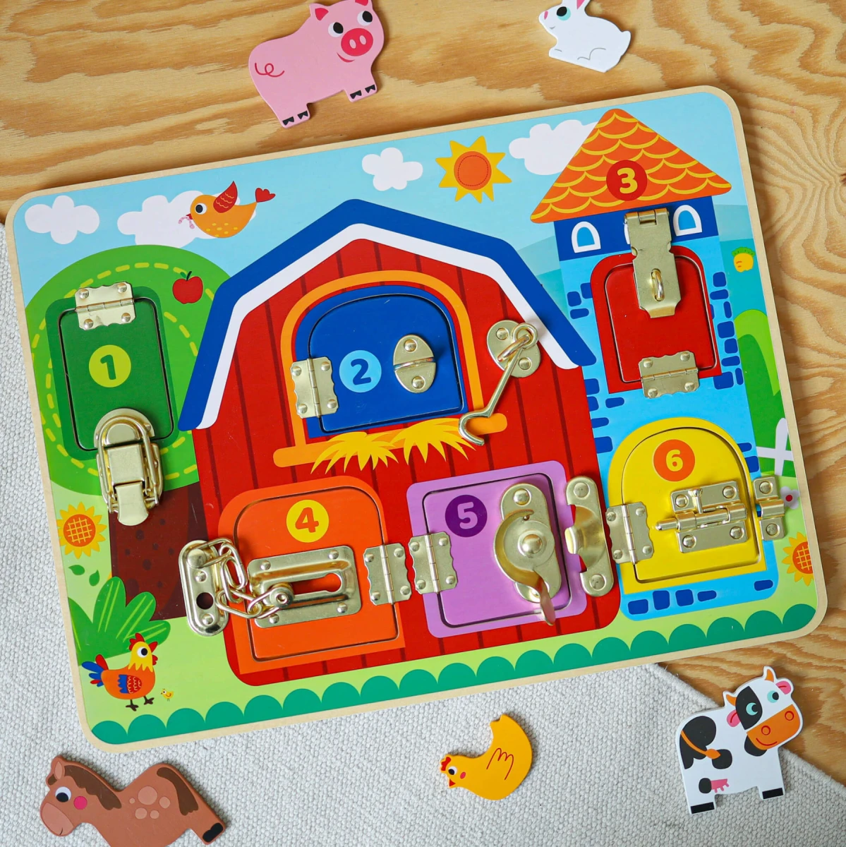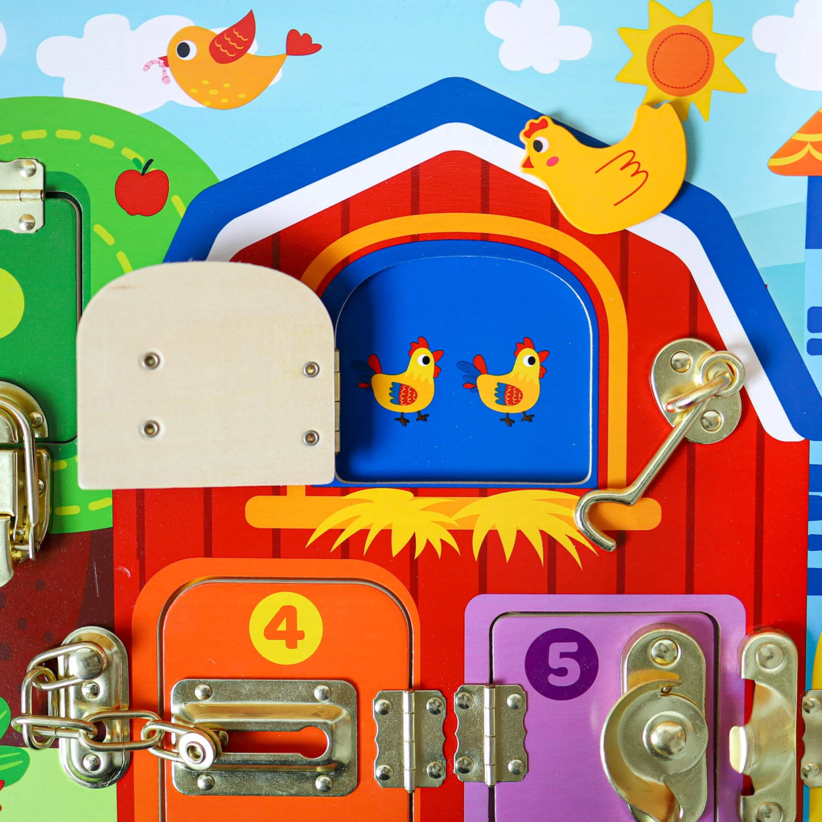 Obsahuje 6 zámkových mechanismů, které děti mohou otevírat a zamykat – učí se samostatnosti a procvičují jemnou motoriku. Farmářský motiv se zvířaty, dveřmi, okny a barevným designem – podporuje dětskou představivost a mluvení. Vyrobeno z kvalitního dřeva, natřené netoxickými barvami, s důrazem na bezpečnost a odolnost.