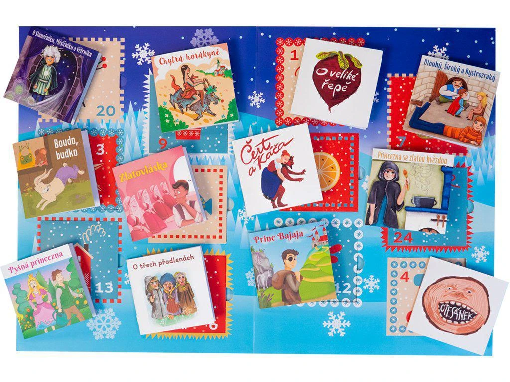 V adventním kalendáři najdete knížečky například s těmito pohádkami: Pyšná princezna, Zlatovláska, Sedmero krkavců, Sůl nad zlato… A mnoha dalšími!