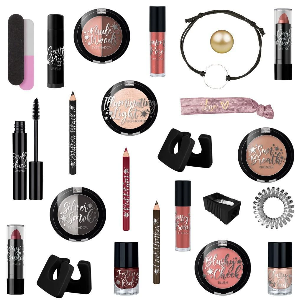Obsah – 1× pilník na nehty, 1×ořezávátko, 1× spirálovou gumičku do vlasu, 2× separátor na lakování nehtů, 1× balzám na rty, 2× lesk na rty, 2× rtěnku, 1× tužku na rty, 1× aršík se samolepkami na nehty, 2× duo oční stíny, 1× oční linku, 1× pudr, 1× tvářenku, 1× náramek s přívěskem, 1× tužku na obočí, 1× řasenku, 2× lak na nehty, 1× mašle do vlasů.