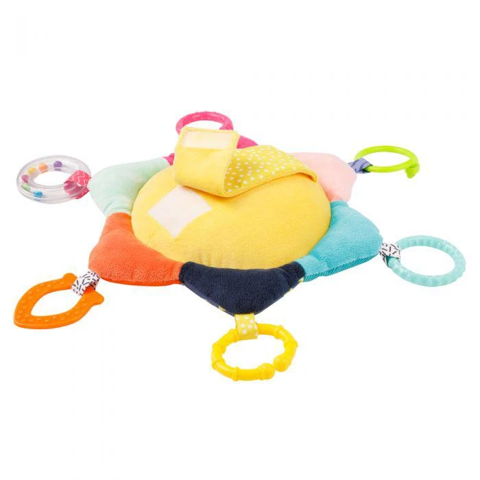pískání, zvlněný papír, chrastítko, hryzátko a uchopovací kroužky stimulují objevitelského a zvědavého ducha dítěte a podporují smysl pro dotek i motoriku - takže toto barevné zrcadlové slunce se rychle stane oblíbenou hračkou dítěte.