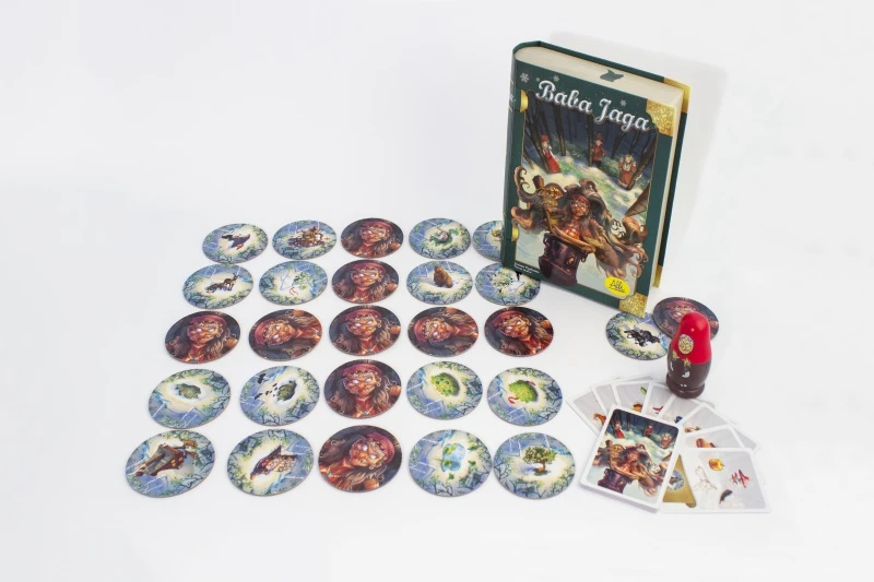 Hra obsahuje: 16 žetonů lesa, 10 žetonů dráhy letu, 1 žeton domu Baby Jagy, 20 karet kouzel, 1 figurka baby Jagy, pohádku a pravidla.