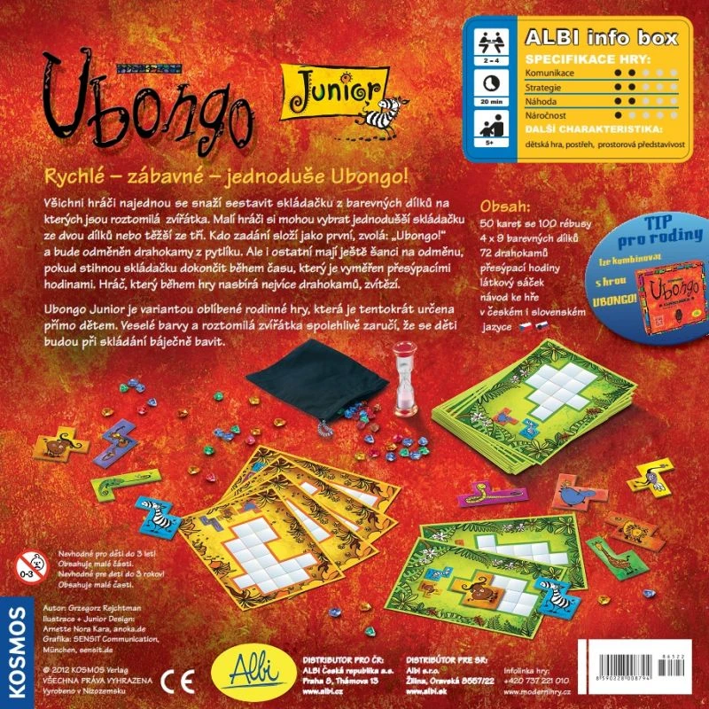 Ubongo Junior je variantou oblíbené rodinné hry, která je tentokrát určena přímo dětem. Veselé barvy a roztomilá zvířátka spolehlivě zaručí, že se děti budou při skládání báječně bavit.