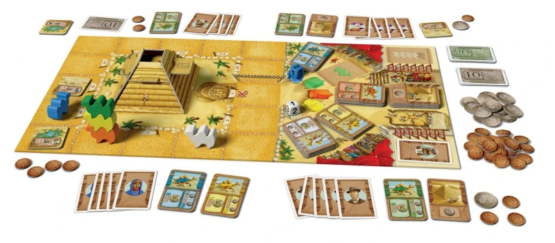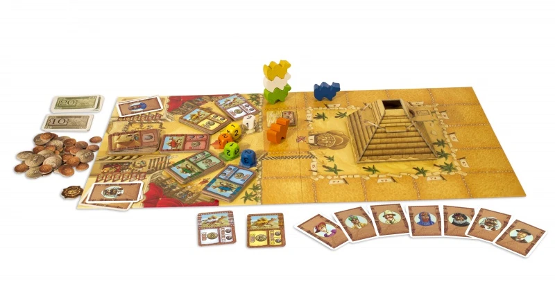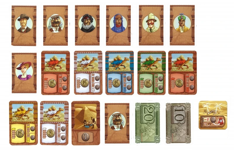 Hra obsahuje: herní plán, pyramidu, 5 velbloudů, 5 kostek, 40 sázkových karet, 8 destiček pouště, 15 destiček etapových sázek, 5 destiček pyramidy, žeton začínajícího hráče, 50 mincí, 20 karet bankovek a pravidla.