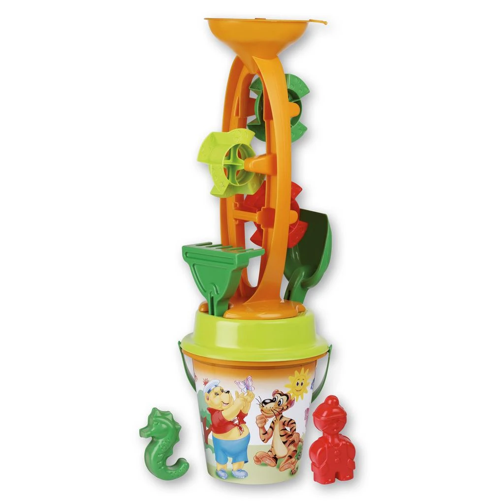 Obsahuje: Kyblík, sítko, lopatku a hrabičky, mlýnek se třemi lopatkovými koly výšky 40 cm a dvě tvořítka.