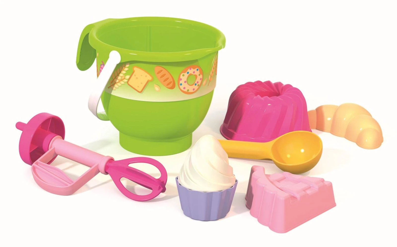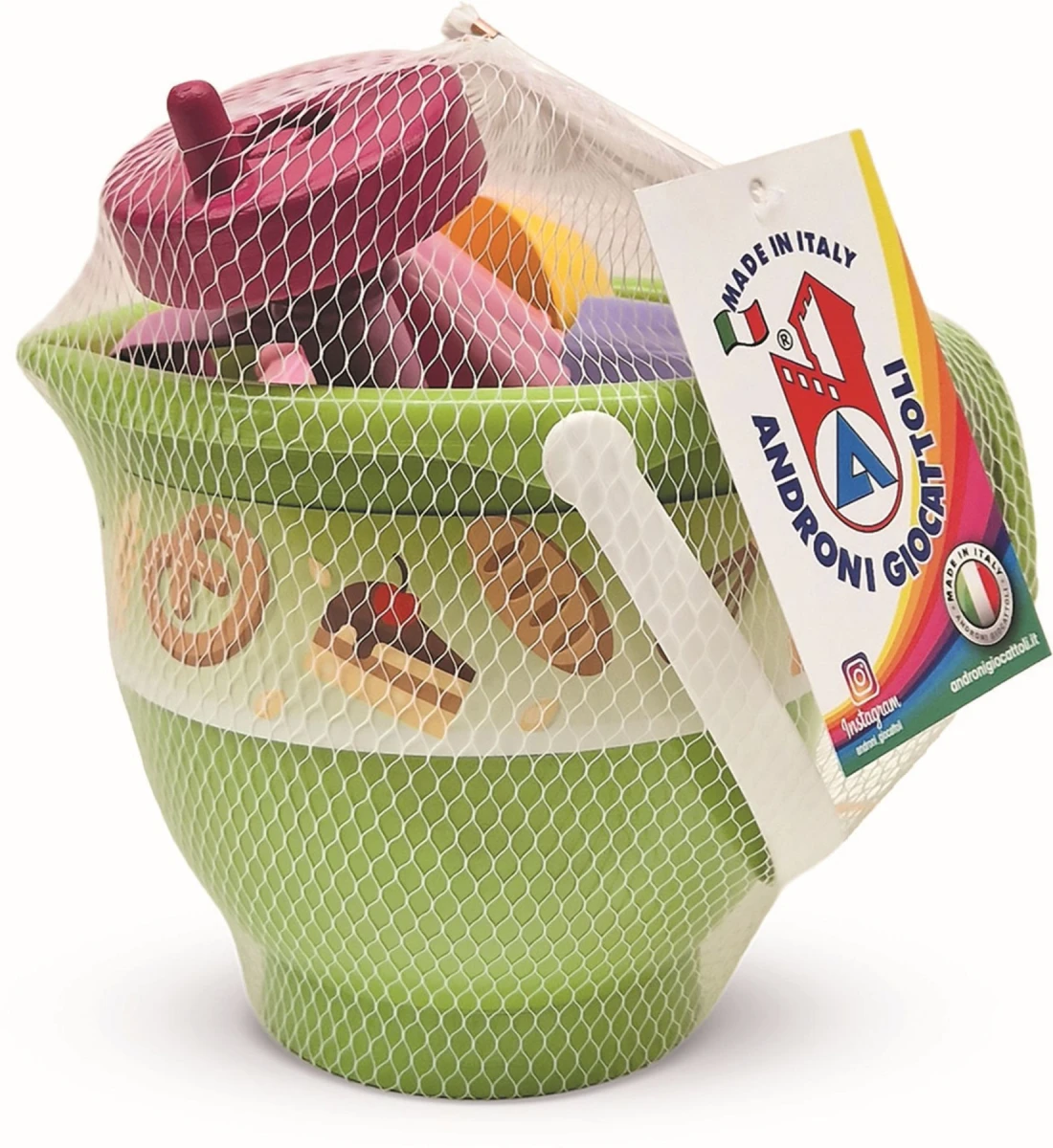 6dílná sada na písek, vyrobená z kvalitních plastů v Itálii. Obsahuje: 1 kyblík na písek ve tvaru vyší mísy s uchem, 1 tvořítko ve tvaru bábovky, 1 tvořítko na dortík, 1 kopečkovač na zmrzlinu a 1 ruční šlehač.