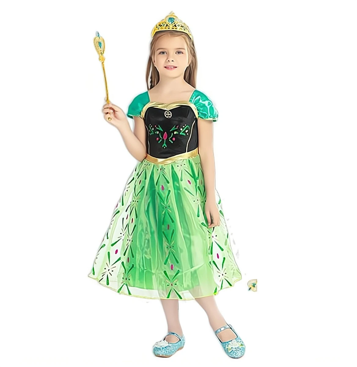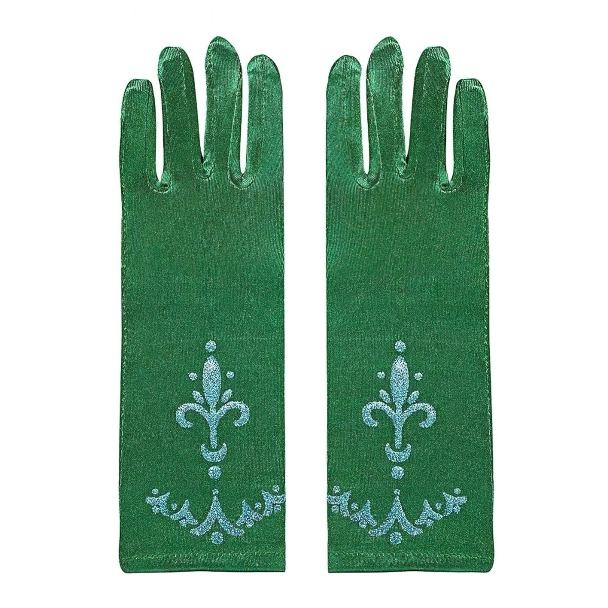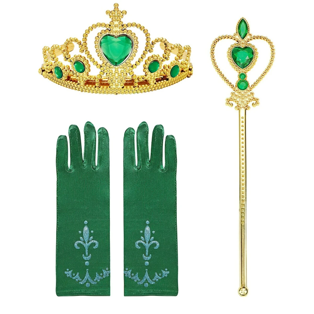 Sada obsahuje tři doplňky – zlatou korunku s tyrkysovými kamínky, ladící kouzelnou hůlku a zelené saténové rukavice s modrým vzorem. Zdobená korunka je vyrobena z lehkého plastu a díky svému lesku a srdcovému kameni uprostřed působí slavnostním a vznešeným dojmem. Je ideální na dětskou hlavu, snadno se nasazuje a dobře drží během hry i pohybu. Zlaté žezlo s detailně propracovanou rukojetí a srdíčkem navrchu slouží jako perfektní doplněk k princeznovským rolím. Děti s ním mohou kouzlit a přenést se do pohádkového světa, kde hrdinka Anna bojuje za dobro, lásku a odvahu. Saténové rukavičky dotvářejí celý vzhled a dodávají špetku elegance.