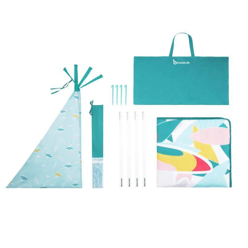 Teepee je dodáván se 4 kolíky, které jej drží pevně na místě v zemi při venkovním použití. Navíc je kompaktní a snadno se skladuje s taškou na přenášení.