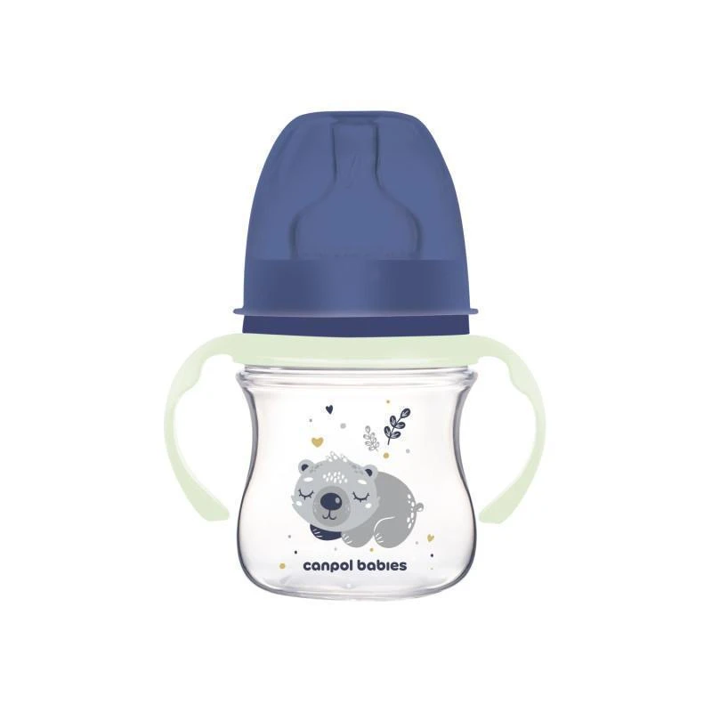 Silikonová savička je měkká, bez chuti a zápachu – usnadňuje dítěti přijetí lahvičky. Jasná a přesná stupnice – umožňuje vám kontrolovat množství, které vaše dítě vypije. Široký otvor – usnadňuje přípravu jídla a mytí lahve. Profilovaný tvar zajišťuje pohodlné držení lahve při krmení. Pohodlné odnímatelné rukojeti svítí ve tmě. Kompatibilní se všemi odsávačkami mateřského mléka Canpol babies. Vhodné pro děti od narození.