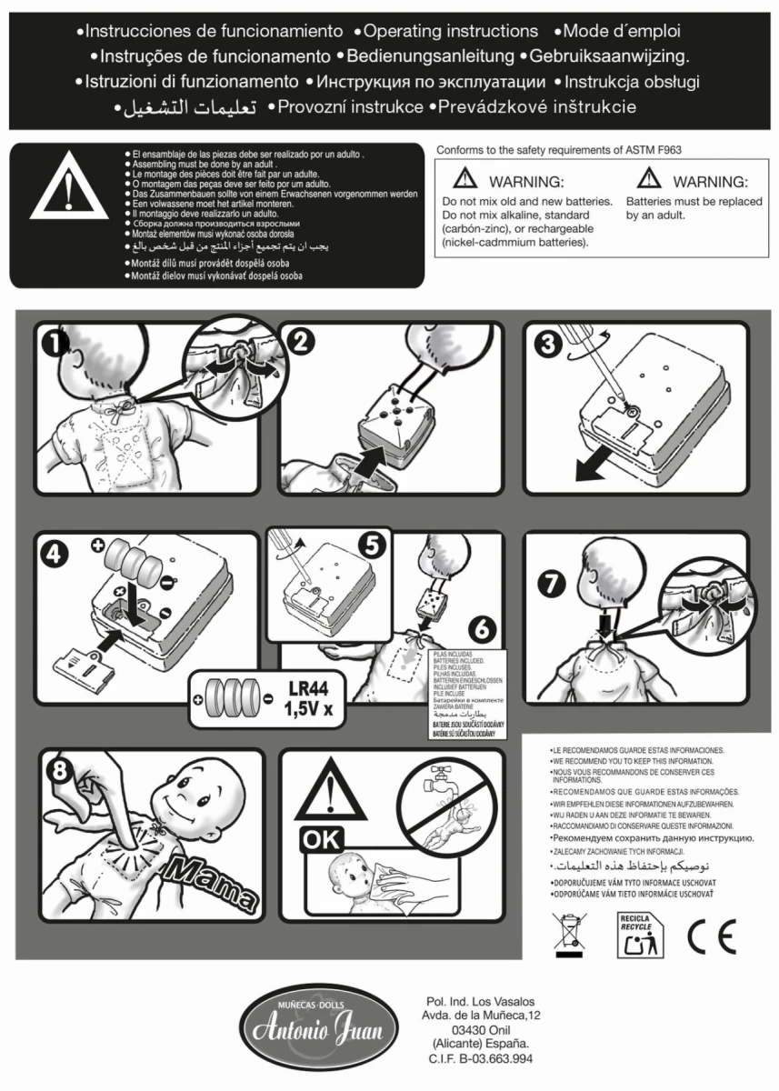 Součástí balení je 3 x knoflíková baterie LR44 s návodem na její výměnu. Baterie jsou spotřební zboží a proto jejich vybití není důvodem k reklamaci panenky.