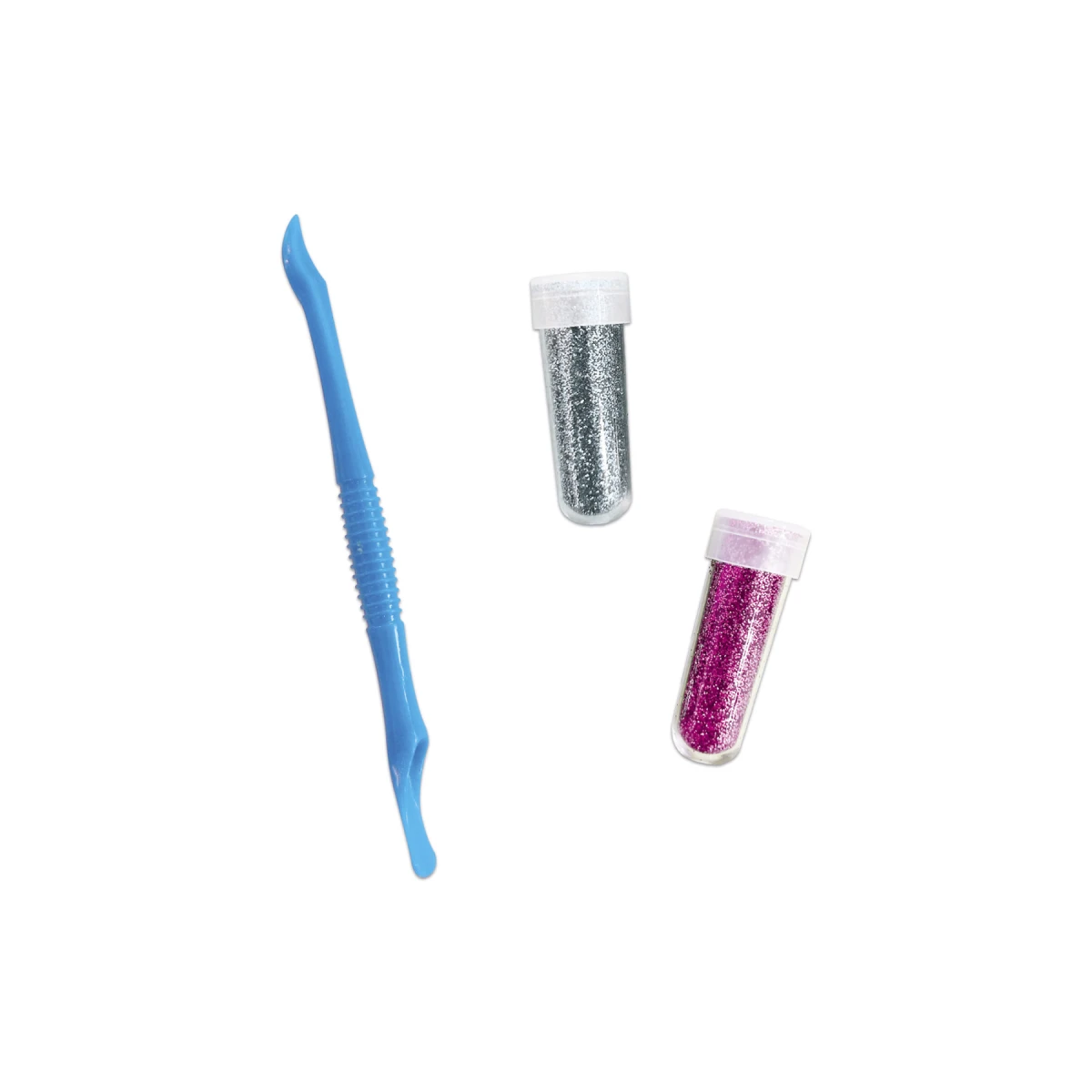 Obsahuje 3 obrázky s vyznačenými oblastmi na ozdobení, 2 tuby s třpytkami (stříbrnou a růžovou), 1 plastový nástroj a 1 brožurku s návodem a vzory.