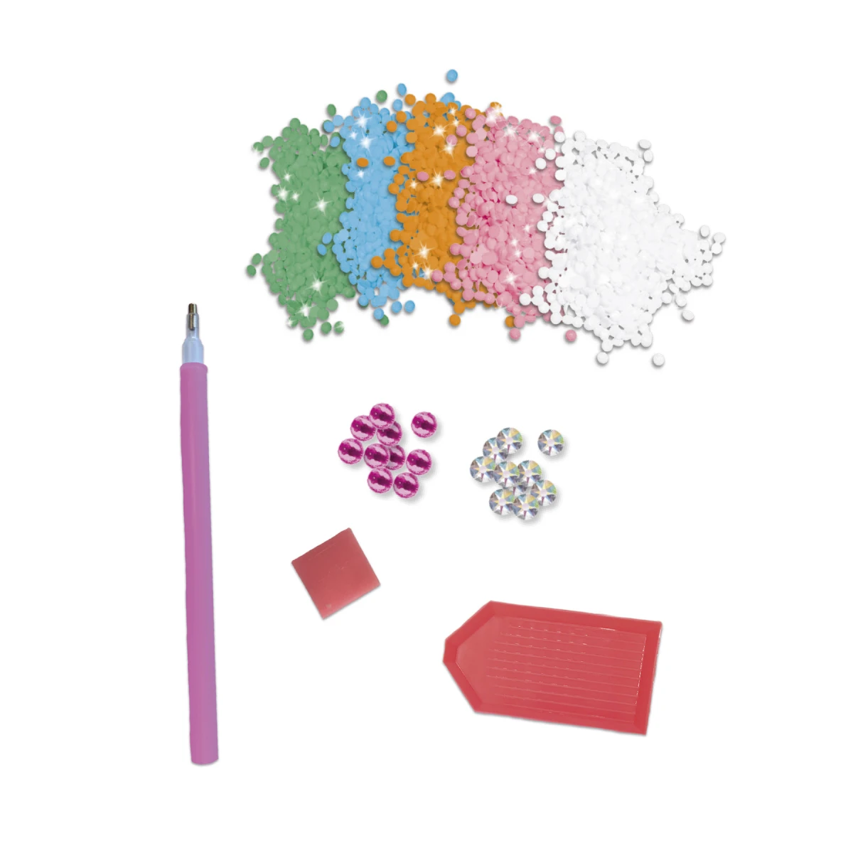 Obsahuje: 1 obrázek (21 x 25 cm), jeden arch s 20 nálepkami s předem určenými lepícími bodkami, 1200 mini kamínků v 5 barvách, z nichž 1 svítí ve tmě, 20 kamínků (o rozměrech 8 mm a 2 barvách), 1 sadu nářadí: 1 vrták, 1 voskový úhelník, 1 misku (snadno se vejde do balení sady) a 1 brožurku s návodem a návrhy.