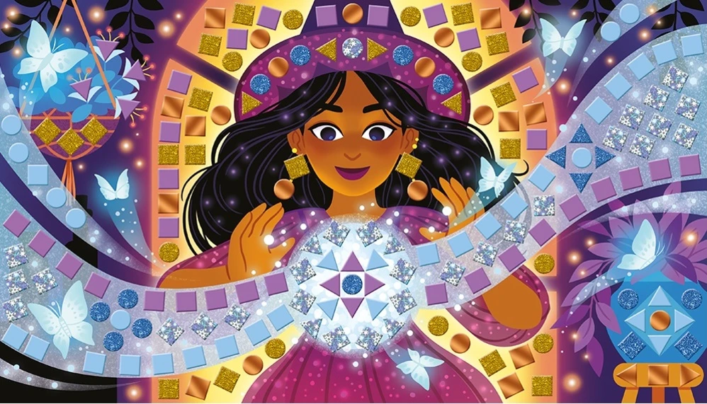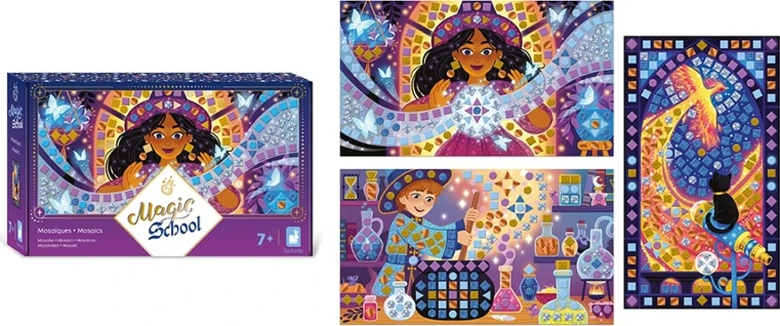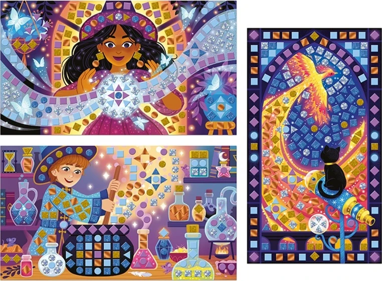 Výhodou této kreativní krabičky jsou mozaiky s různými vizuálními efekty: matné, třpytivé, holografické a metalické. Pro magický a uspokojivý výsledek! Co se týče jejich pěnové textury, velmi zpříjemňuje činnost a usnadňuje manipulaci s mozaikami. Tato manuální aktivita na téma čarodějnice a kouzelníci ponoří děti do snových scén (let Fénixe, kouzlo křišťálové koule či vaření tajemného kotle).