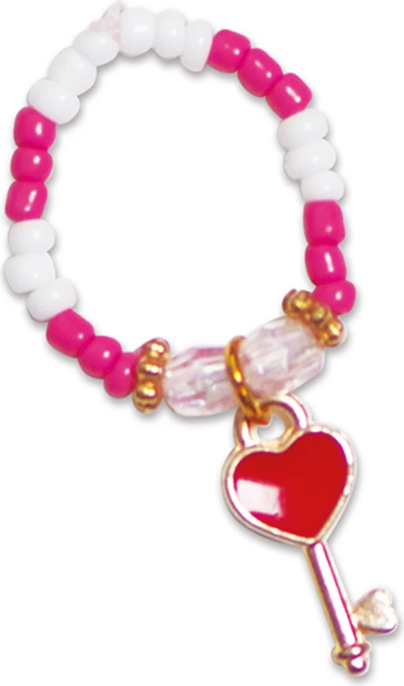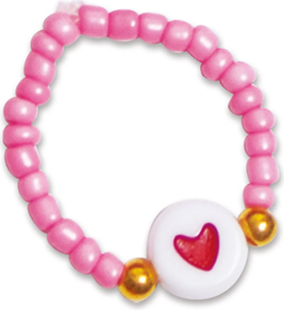 Obsahuje: 300 korálků, 40 zlatých korálků, 16 průhledných fasetovaných korálků, 15 růžových duhových korálků, 6 distančních korálků, 3 přívěsky, 2 hvězdičkové korálky, 1 korálek s potiskem srdce, elastickou nit, 1 pohár 1 brožurku s návodem a designem