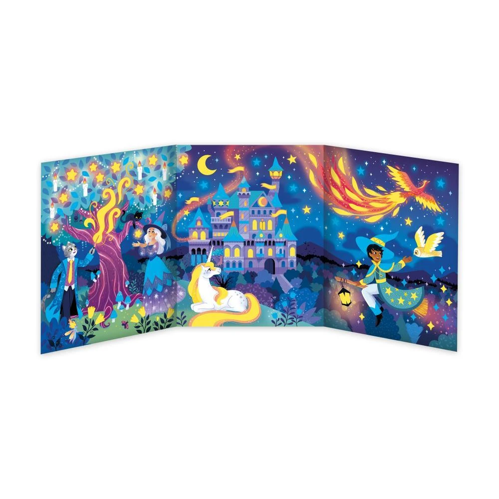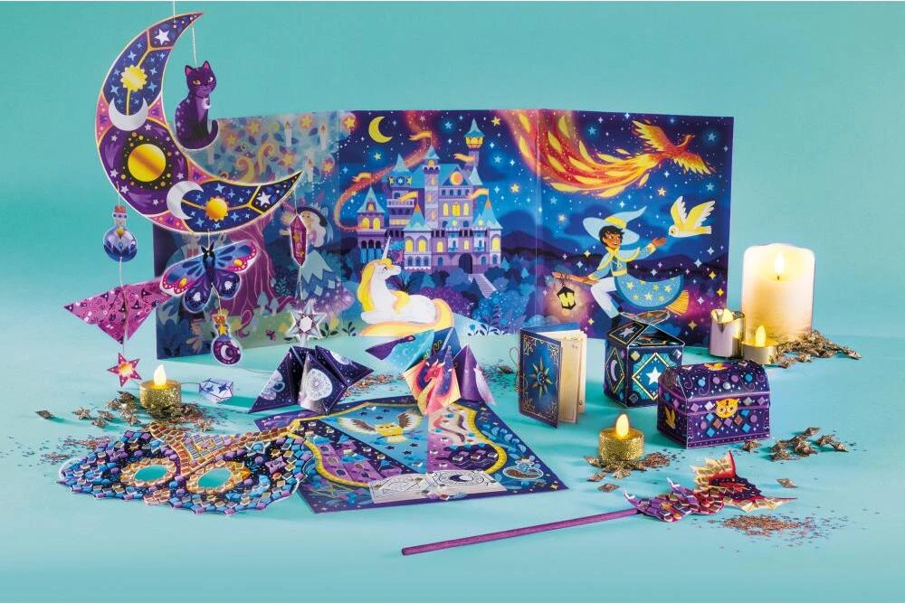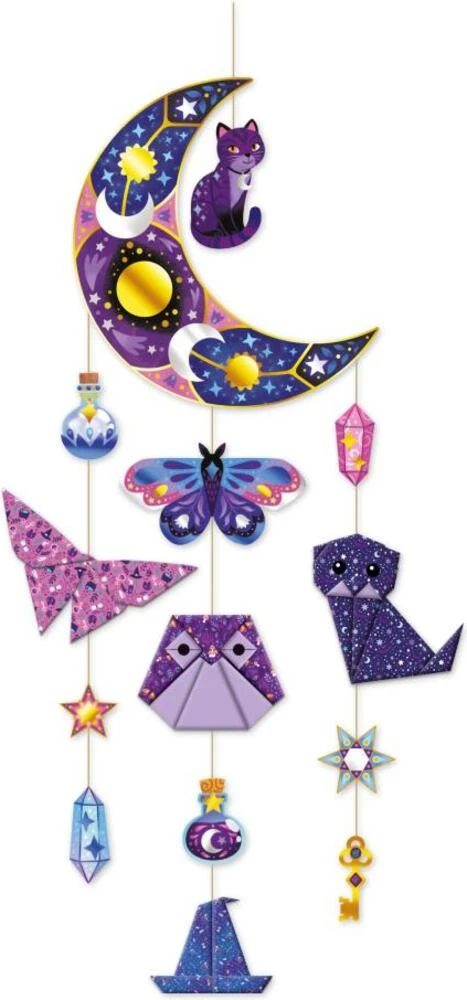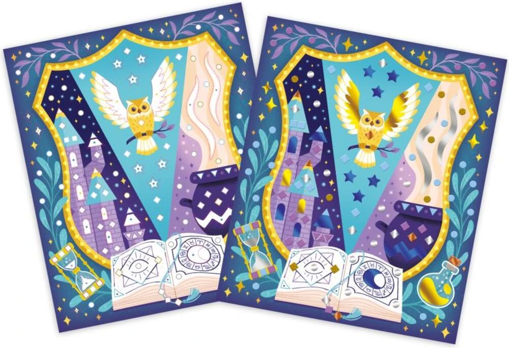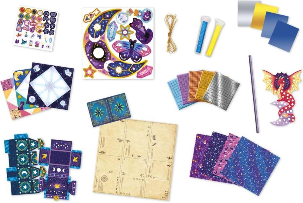 Tato multifunkční souprava obsahuje: 1 triptychonový pískový obrázek, 1 masku, 1 čarodějnický proutek a 1 čarodějnický erb na doplnění samolepicí pěnovou mozaikou, 1 lapač měsíce na ozdobení origami, 3 papírové věštkyně na přizpůsobení nálepkami, 2 malé krabičky a 1 knihu kouzel na sestavení.