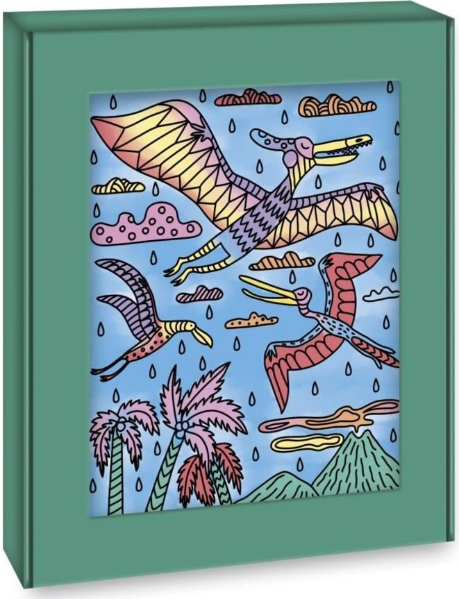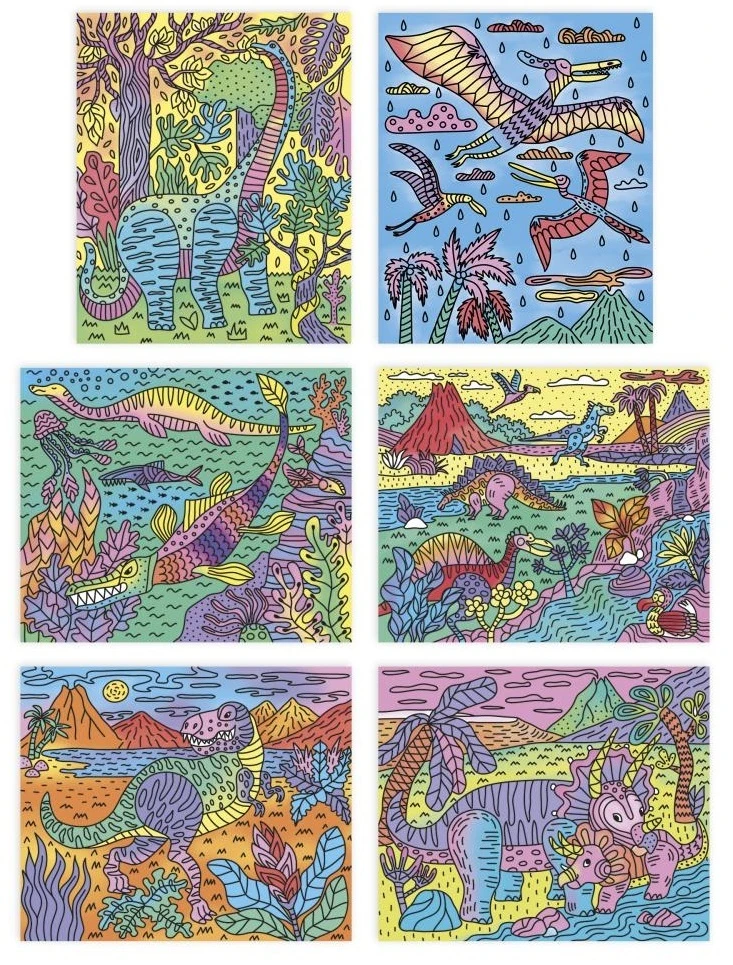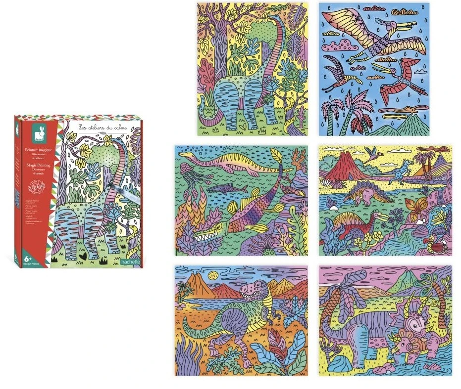 Součástí této sady je 6 magických maleb. Produkt s motivem dinosaurů zobrazuje druhy, které si děti určitě zamilují! Naučí se dávat pozor, aby se barvy navzájem nemíchaly. Vysvětlující brožurka jim pomůže uvést jejich krásné obrazy do života, krok za krokem! A to není všechno... Krabice se promění na rám, kterým orámujete své nádherné výtvory! Dokončení každého obrázku trvá přibližně 1 hodinu.