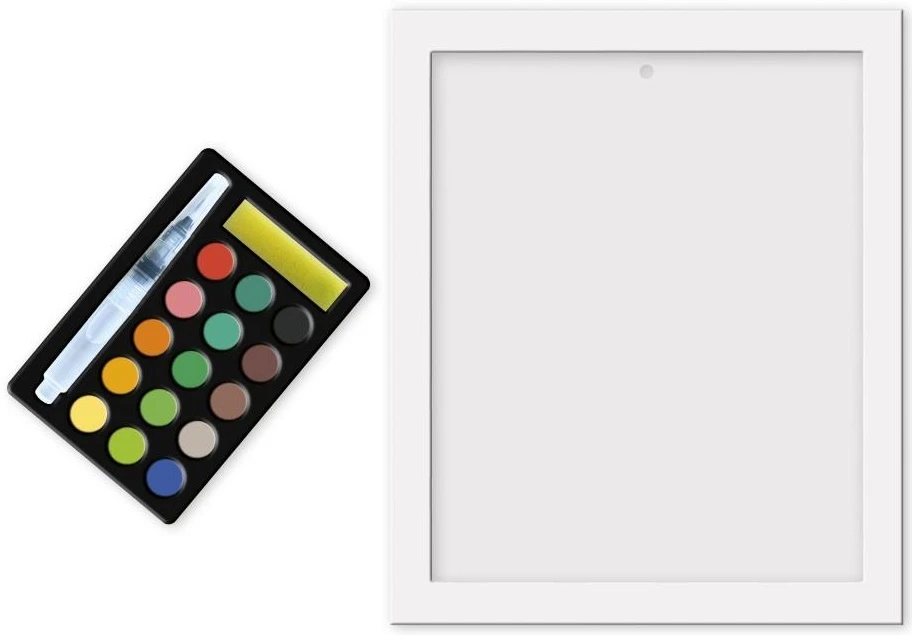 Obsah: paleta s vodovými barvami, plnitelný štětec, 2 obrázky na vymalování (1 se zlatou potiskem), rám.