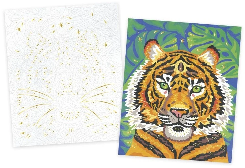 Paleta 15 akvarelových barev, houbička a vodní štětec dělají z této sady originální a ucelenou aktivitu. Vysvětlující brožurka označuje barvu odpovídající každému číslu. Jeden ze dvou obrazů se může pochlubit pozlacenými efekty, které výtvory ještě více zkrášlují. Další praktický nápad: krabice se promění na stojan, aby byla činnost jednodušší!