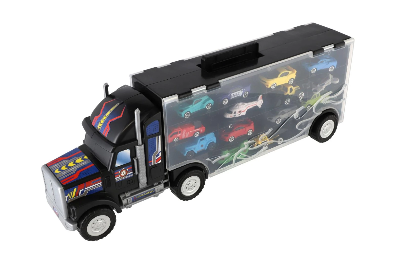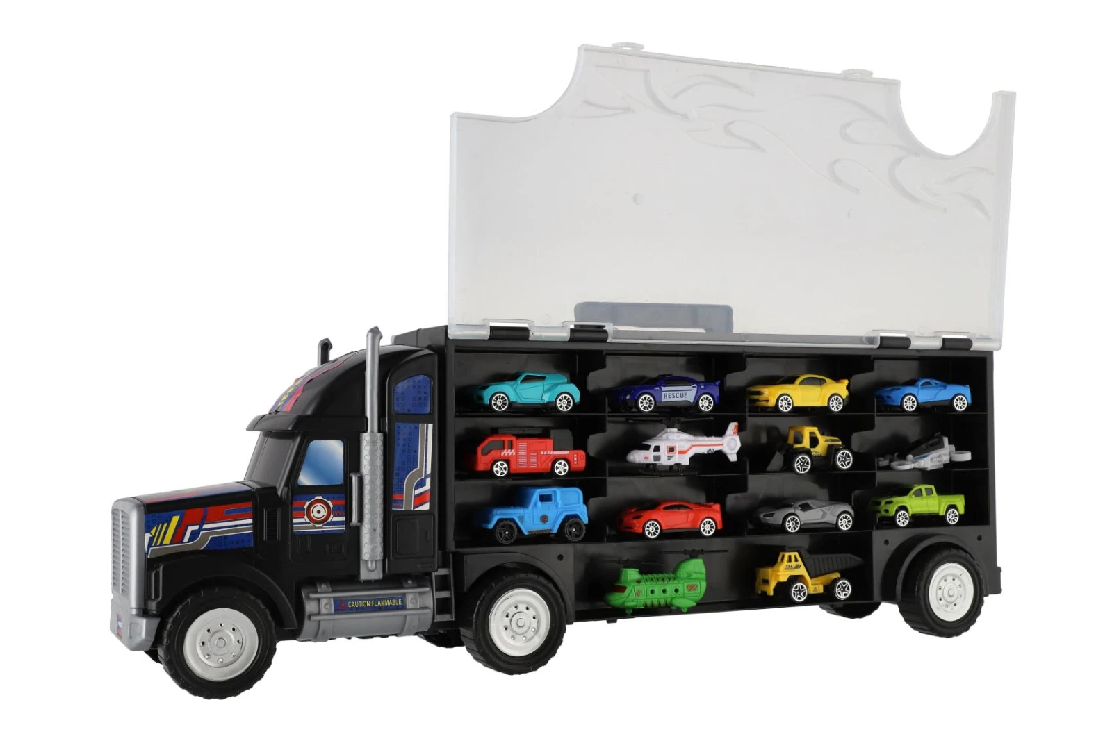 Díky průhledným dvířkům jsou autíčka přehledně uspořádaná a vždy připravená na další jízdu. Kamion má otevírací boční panel a pevnou konstrukci, která umožňuje snadné přenášení i uklízení. Ideální hračka pro rozvoj dětské fantazie, motoriky a kreativní hry.