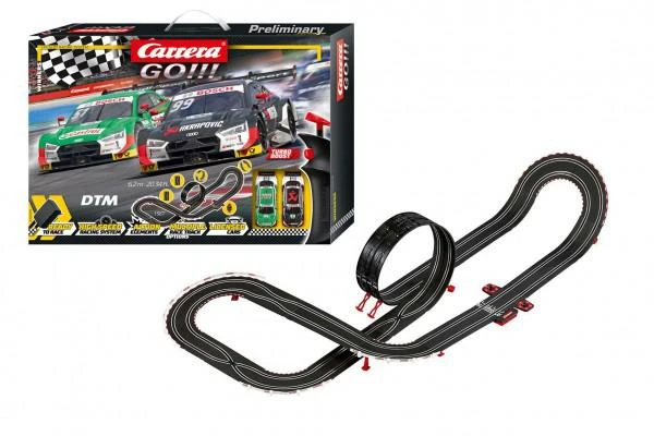 Autodráha Carrera GO!!! dlouhá 6,2m s auty Audi RS 5 DTM a Audi RS 5 DTM, obsahuje křížení dráhy, kolmou stěnu, looping, zúžení dráhy, rovinky, zatáčky, díl s počítadlem kol a skokánek navíc! Můžete si sestavit další různé trati podle plánu na obalu.
