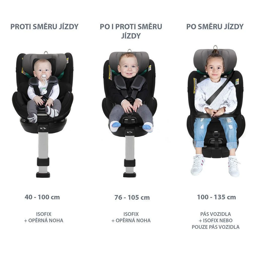 Od narození až do 19,5 kg chrání děti 5bodový bezpečnostní pás s kvalitní sponou Immi. V této fázi se autosedačka poutá pomocí isofixu a opěrné nohy. Děti mohou jezdit proti směru jízdy až do 105 cm. Díky otáčení lze od 76 cm zvolit také jízdu po směru. Až dítě povyroste, jednoduše přejdete na poutání 3bodovým pásem vozidla. Opěrná noha se sklopí pod autosedačku. Vaše dítě je perfektně chráněné od narození až do 135 cm.
