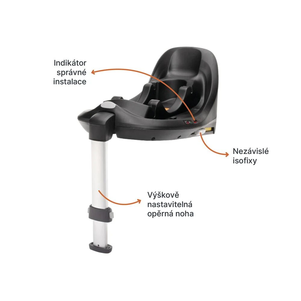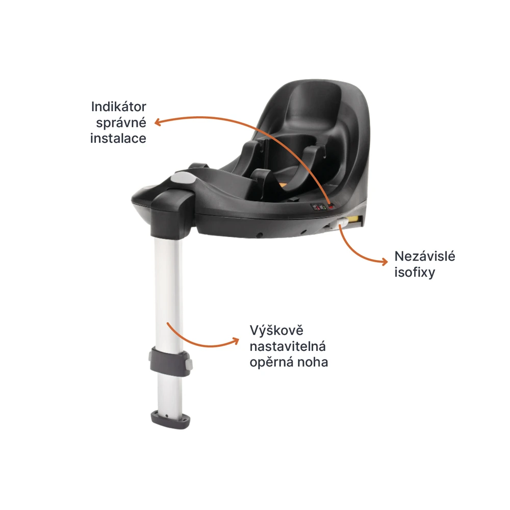 Nezávislé ISOFIX s indikátory pro snadnou a bezpečnou instalaci autosedačky do vozidla. Autosedačka disponuje opěrnou nohou, která přidává další bod pro větší stabilitu i opěrná noha má svůj indikátor správného nastavení. Lepší stabilitu zajistí také bezpečnostní oblouk. Správnou instalaci autosedačky na základnu vám potvrdí indikátory správné instalace. Sejmutí autosedačky ze základny jednoduše přes pojistku.