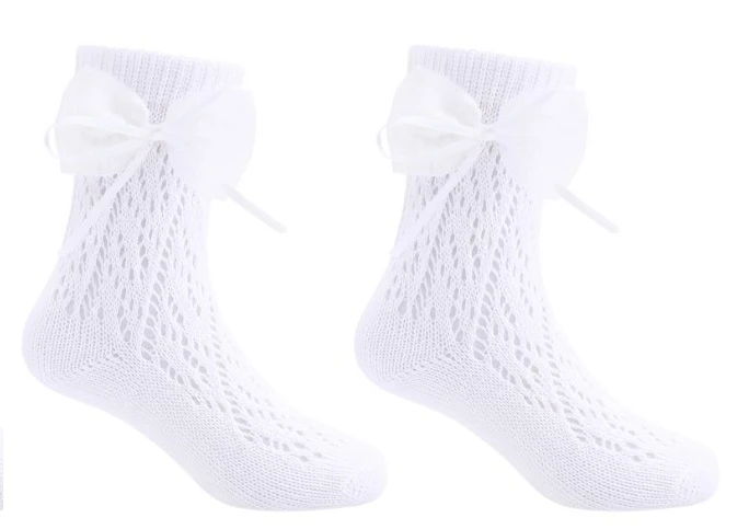 Ažurové ponožky bílé s krajkovou mašličkou perforované
