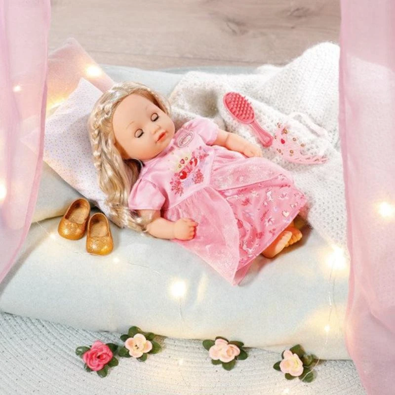 Panenka velikosti 36 cm má látkové tělíčko s měkkou výplní uvnitř a kvalitní vlásky. Má svůj vlastní kartáč na princeznovské účesy. Účesy ozdobí diadém se třpytivými kamínky. Pod nádhernými růžovými šaty s tylovým volánem se třpytí zlaté balerínky. Převlékání šatiček ve stylu „easy fit“ hravě zvládnou i nejmenší ručičky.