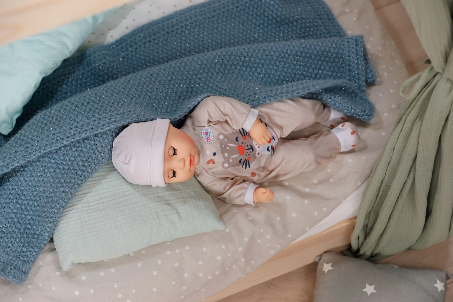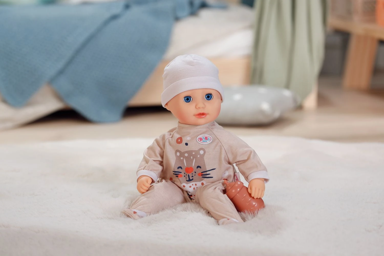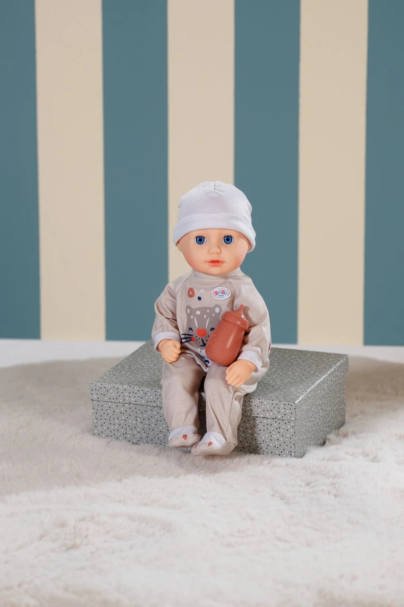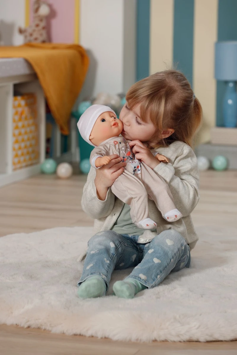 Když ji po lahvičce uložíte ke spánku, její oči se jemně zavřou, jako by pokojně usínala. Kromě lahvičky má Anna jednoduché béžové dupačky s roztomilým potiskem tygříka. Roztomilý design a pečlivě zpracované detaily dělají z oblečku opravdový originál. Čepička celý komplet krásně doplňuje a dělá z Anny perfektní společnici pro každé dobrodružství a mazlení.