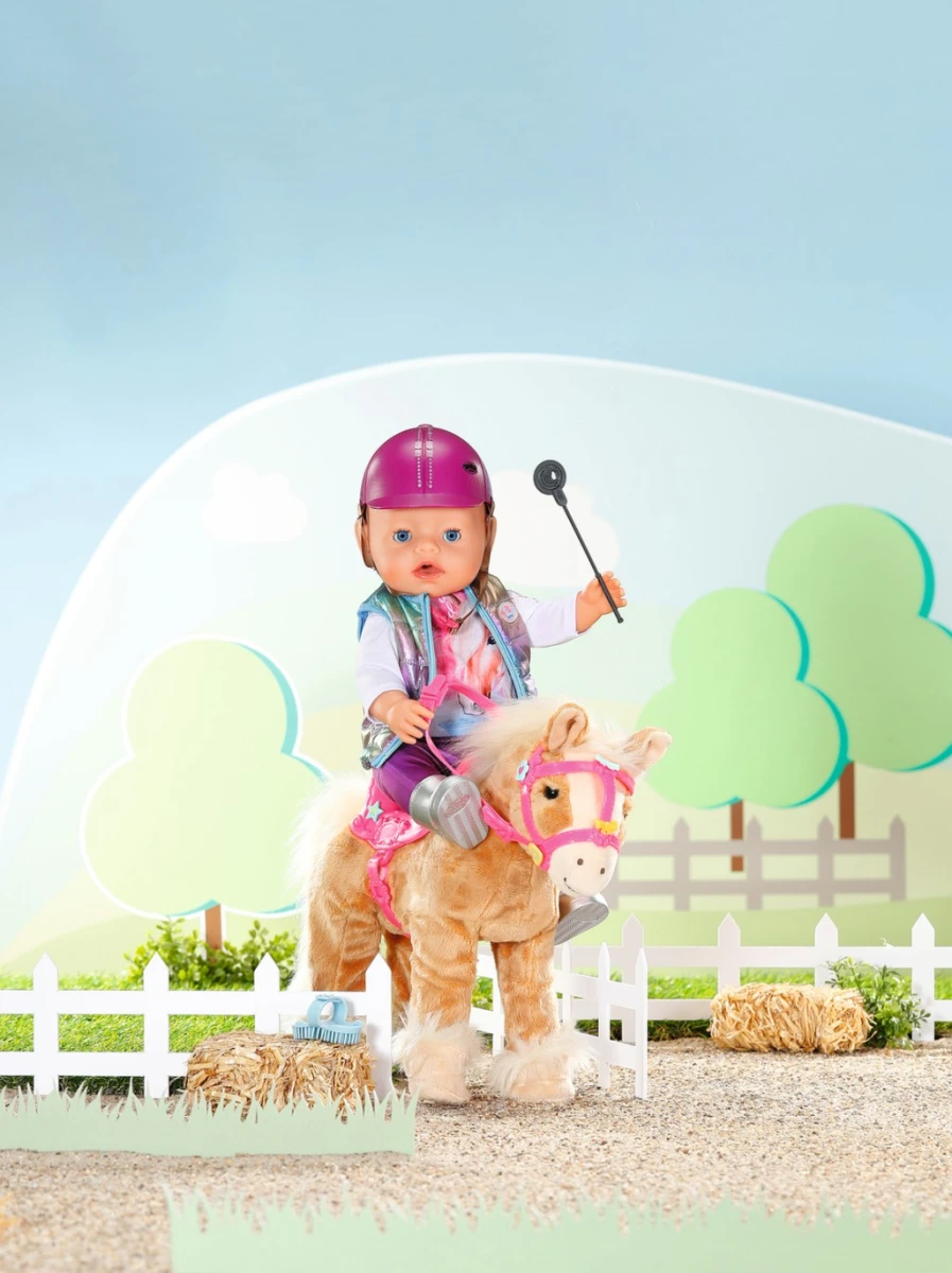 Samozřejmě nechybí ani jezdecká přilba – bezpečnost je přece na prvním místě! Myslelo se i na koníka BABY born – v sadě najdete bičík a kartáč, aby mohl být krásně vyhřebelcovaný před každou jízdou.