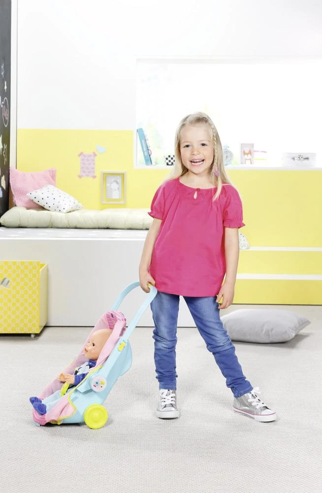 1 – 2 – 3, tahle skvělá cestovní sedačka na kolečkách se třemi funkcemi bude stále s vámi, kamkoli se s BABY born® vydáte. Cestovní sedačka se třemi funkcemi, jak to vlastně funguje? Nejdříve je tu přenášecí funkce: cestovní sedačku můžete jednoduše a pohodlně přenášet z místa A do místa B uchopením za tyrkysové madlo. Kdyby se BABY born® cestou nudila, může si čas zkrátit třeba počítáním hvězdiček na pruhované látce, která sedačku zdobí. Funkce číslo dvě – sedačku snadno nastavíte do vzpřímené pozice a sedačka pak funguje jako křesílko, které BABY born® poskytne skvělý výhled všude kolem. A teď přichází zlatý hřeb, funkce číslo tři. Díky kolečkům můžete BABY born® v sedačce pohodlně táhnout vedle sebe. Sedačka je samozřejmě vybavena bezpečnostními popruhy, a tak je BABY born® na cestách vždy v bezpečí. Slyšíte, jak říká „Rychleji, rychleji!“ • Originální doplněk pro panenky BABY born®. • Pečlivě navržené doplňky rozvíjejí dětskou představivost a otevírají nové možnosti a témata hry. BABY born® Přenosná sedačka na kolečkách pro přenášení, sezení a převážení.