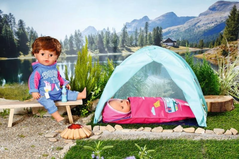 BABY born Víkendová Sada na kempování obsahuje stan, spacák, táborák, marshmallow a láhev limonády.