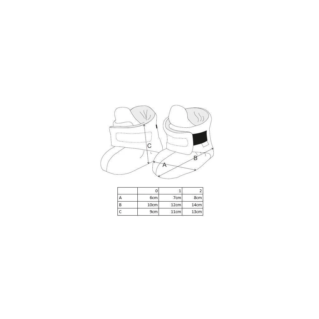 vel. 1: 7 cm ( šířka chodidla ), 12 cm (délka chodidla ), 11 cm (výška bačkorky )