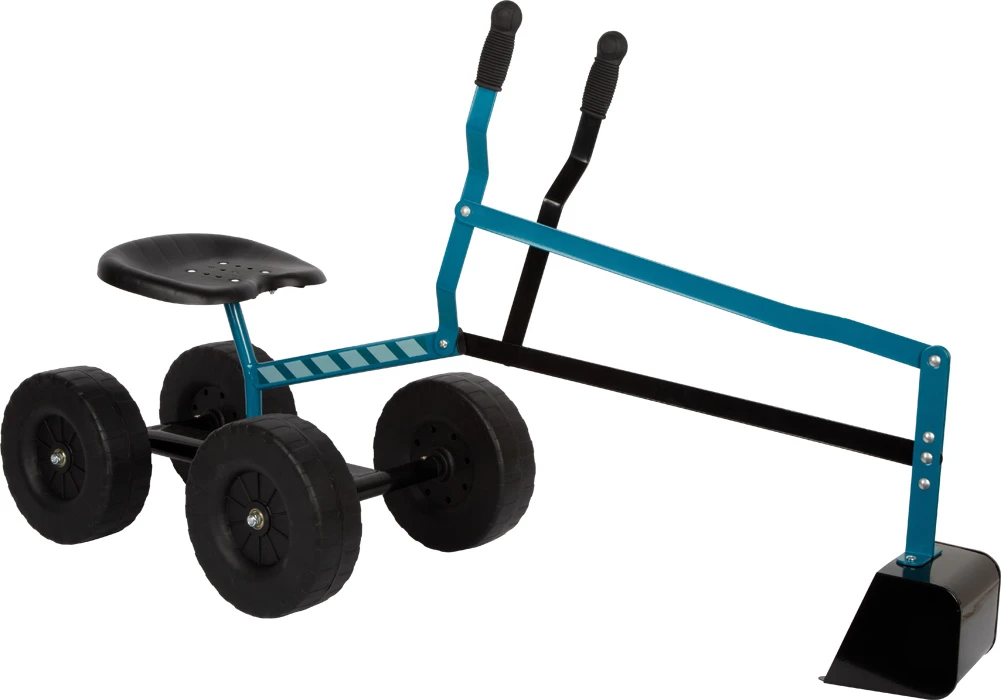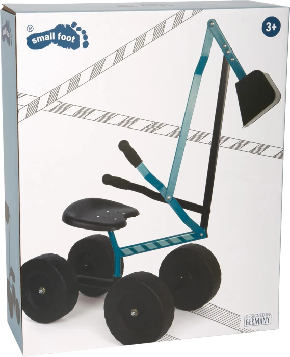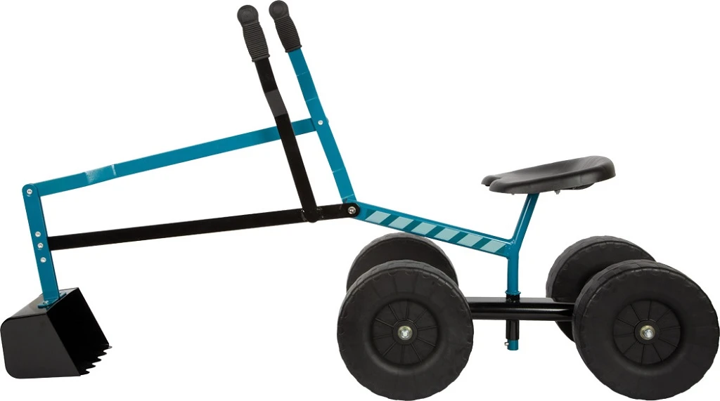 Pevný kovový rám je navržen pro zatížení až 50 kg a doplněn pohodlným plastovým sedátkem. Díky velkým kolům o průměru 20 cm je bagr snadno pojízdný a děti s ním mohou samostatně manévrovat po pískovišti i zahradě.