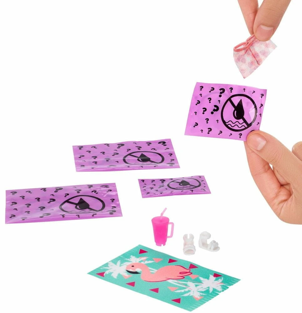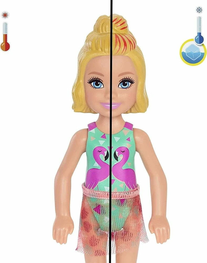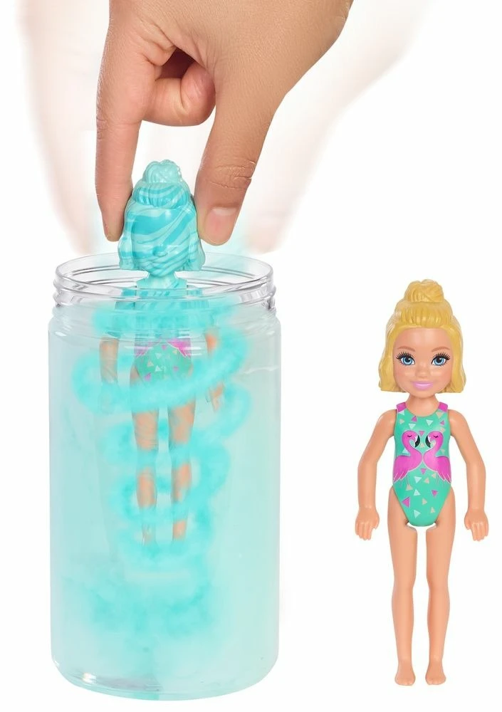 Panenky Barbie® Color Reveal™ Chelsea™ přinášejí zážitek z rozbalování plný překvapení – je jich hned šest! Roztomilá panenka Chelsea v třpytivém oblečku je jistá, ale vzhled každé panenky zůstává tajemstvím, dokud není odhalen. Obal je součástí zábavy – zatáhněte za proužek, abyste odstranily vnější vrstvu, a odhalíte průhlednou tubu. Uvnitř je panenka Color Reveal™ Chelsea v tajemné modrozelené metalické barvě a čtyři tašky ukrývající překvapení. Všechny je vyjměte a naplňte tubu teplou vodou, poté vložte panenku a zatočte s ní. Voda změní barvu na mramorovou modrozelenou a když je panenka vytažena, odhalí se její rysy! Každá panenka má jinou kombinaci barvy očí, vymodelovaných mramorových vlasů, tónu pleti, zdobeného živůtku a lesklých mramorových nohou, ale překvapení pokračují ... otevřete tašky a naleznete paruku s culíkem, třpytivou sukni a sladěné boty a módní doplněk! Použijte ledově studenou vodu, abyste odkryly zábavnou dekoraci obličeje na tváři panenky Chelsea™ – děti mohou znovu a znovu opakovat tento okamžik úžasu! Každá série má jedinečné téma – tyto panenky Color Reveal ™ Chelsea™ jsou celé o lesku a mramorovém stylu, a to díky vymodelovaným mramorovým vlasům a nohám a barevným nasazovacím parukám s culíkem. Tubu využijte na uložení těchto a dalších oblíbených doplňků Barbie® a Chelsea™. Jakou panenku odhalíte? Děti je mohou sbírat, aby kombinovaly a přiřazovaly doplňky a rozšiřovaly možnosti. Každá se prodává samostatně, v závislosti na dostupnosti. Barvy a dekorace se mohou lišit.