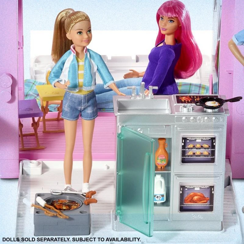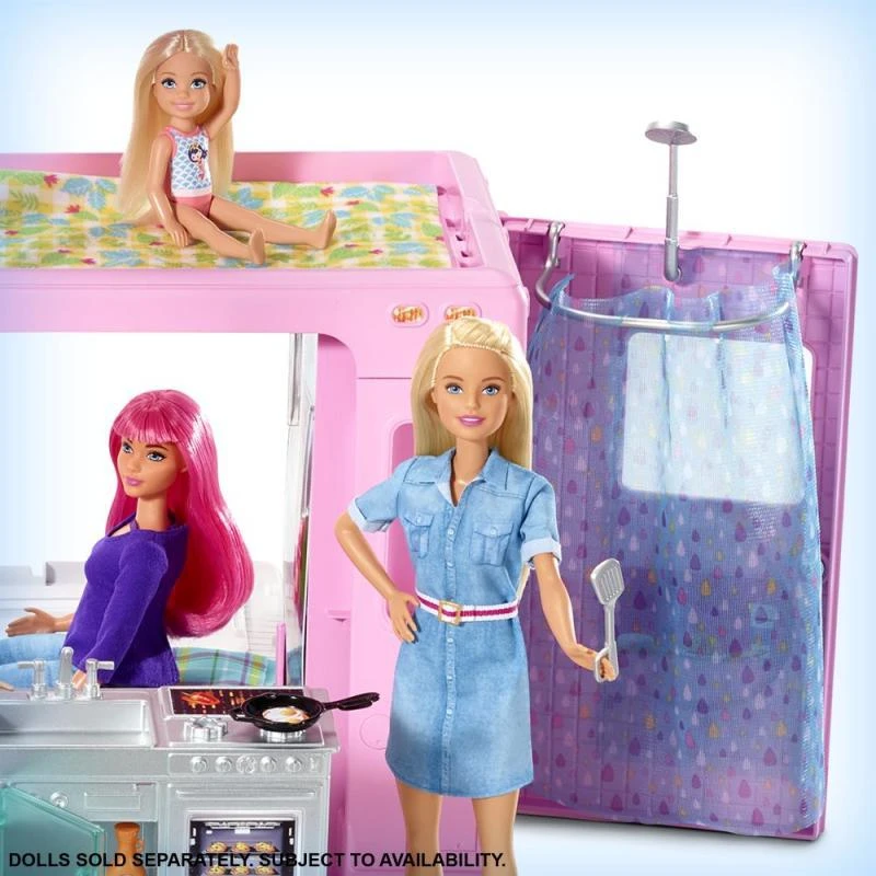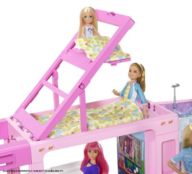 Mrkni pod zadní sedačku a objevíš loď jako stvořenou pro rybaření. Když je čas se utábořit, odklop boky karavanu a proměň jej v kempovací herní set. Užij si spoustu zábavy u bazénu, uvař něco dobrého v kuchyňce nebo si odpočiň v útulném obýváku. Nechybí samozřejmě ani vybavená koupelna. V každé části karavanu se ukrývá tolik příběhů! Po dlouhém dni plném hraní připrav pro své panenky spaní na střeše karavanu, kde mohou sledovat hvězdy.