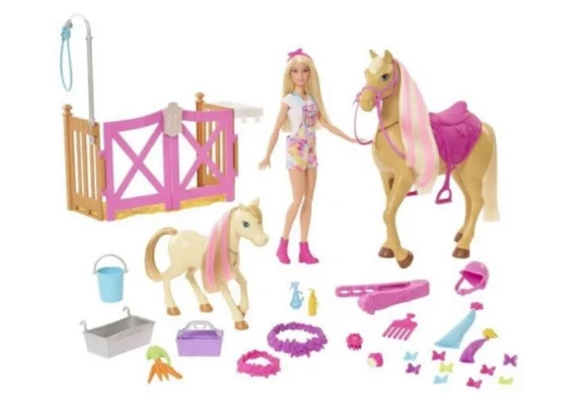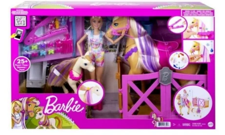 Kartáčujte hřívu obou zvířátek a poté použijte ledovou vodu k odhalení barevných melírů! Teplou vodu použijte ke změně barvy na původní, a celý postup opakujte znova a znova. Připevněte příčesek nebo květinovou korunu, pak nabijte speciální kadeřnický přístroj k aplikaci rozkošných motýlkových spon na hřívu koníků nebo vlasy Barbie® panenky. Když děti dokončí úpravu vzhledu kamarádů, mohou pomoct Barbie® panence nakrmit zvířátka mrkví – oba koníci umějí reagovat na krmení dobrotou kýváním hlavy.