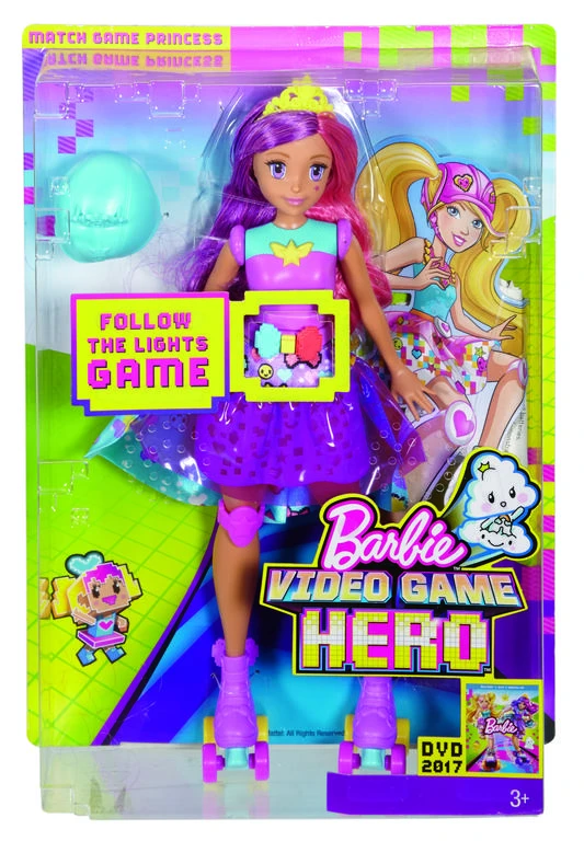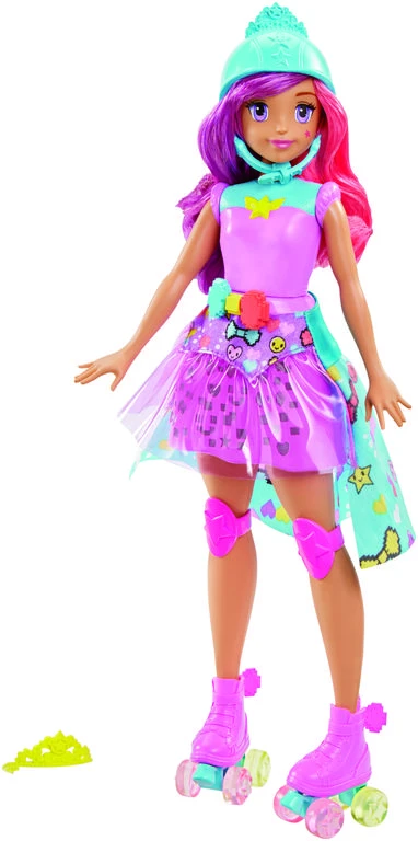 Během hry se růžová sukně panenky rozsvítí různými barvami a tvým úkolem je toto barevné schéma zopakovat pomocí odpovídajících barevných tlačítek na jejím pásku. Pokaždé když uspěješ, se hra stává obtížnější. Otestuj svou paměť na maximum díky pěti různým úrovním! Panenka je v růžovém živůtku, svítící růžové sukýnce s vlečkou, chráničích a skutečných bruslích připravena na další zábavu! Vyměň panence zlatou korunku za modrou závodní helmu a závod může začít! Vytvoř si sbírku všech panenek z kolekce Barbie™ ve světě her.