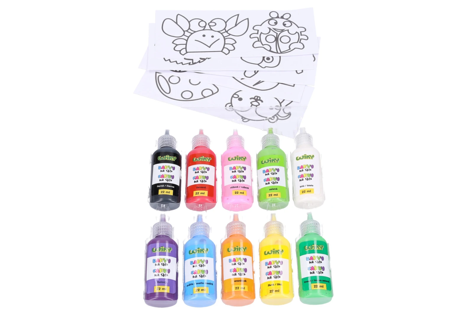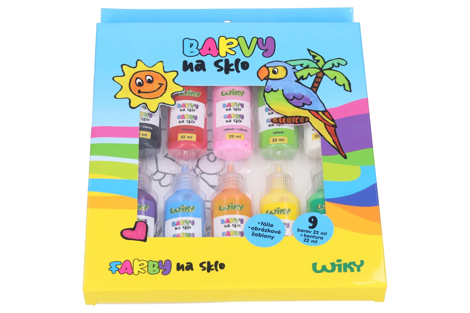 Obsahuje: 9 barev (červená, růžová, zelená, bílá, fialová, světle modrá, oranžová, žlutá, tmavě zelená) 22 ml + kontura černá 22 ml + 2 fólie + obrázkové šablony.