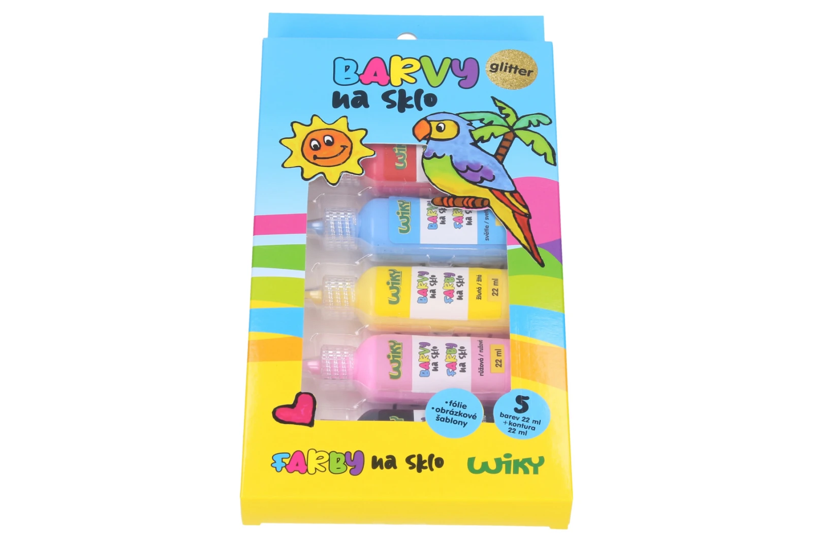 Obsahuje: 4 barvy (růžová, žlutá, světle modrá, červená, zelená) 22 ml + kontura černá 22 ml + 2 fólie + obrázkové šablony.