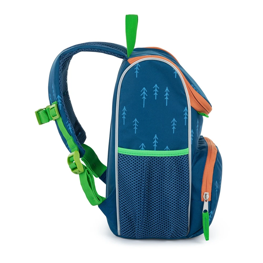 Má jednu velkou kapsu, menší kapsu na svačinu a postranní kapsičky na lahev na pití.