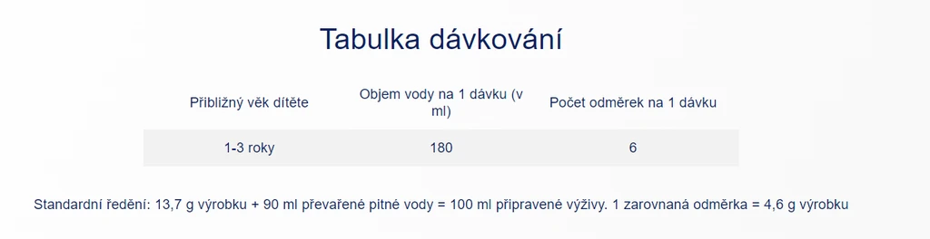 DŮLEŽITÉ INSTRUKCE PRO KRMENÍ: Používejte správné množství zarovnaných odměrek, jak je instruováno. Dítěti může být špatně při použití více nebo méně odměrek, než je nařízeno. Pokud připravené UM nevyužijete do 2 hodin od připravení, doporučujeme jej vylít a připravit nové. Nepřidávejte do připraveného UM produkty, které jsou určené pro dospělé, jako je trvanlivé kravské mléko apod. Neohřívejte v mikrovlnné troubě. Pro zdraví dětí je důležité důsledné dodržování návodu na přípravu a skladování. Potravina pro zvláštní výživu.