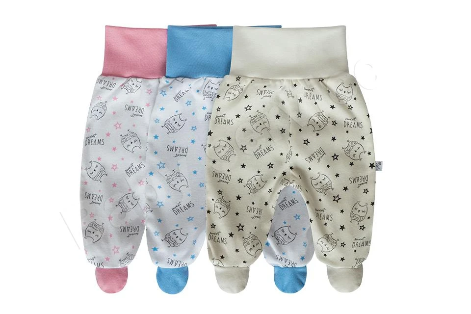 Bavlněné polodupačky pro kojence s potiskem soviček mají v pase široký úplet pro pohodlí miminka.