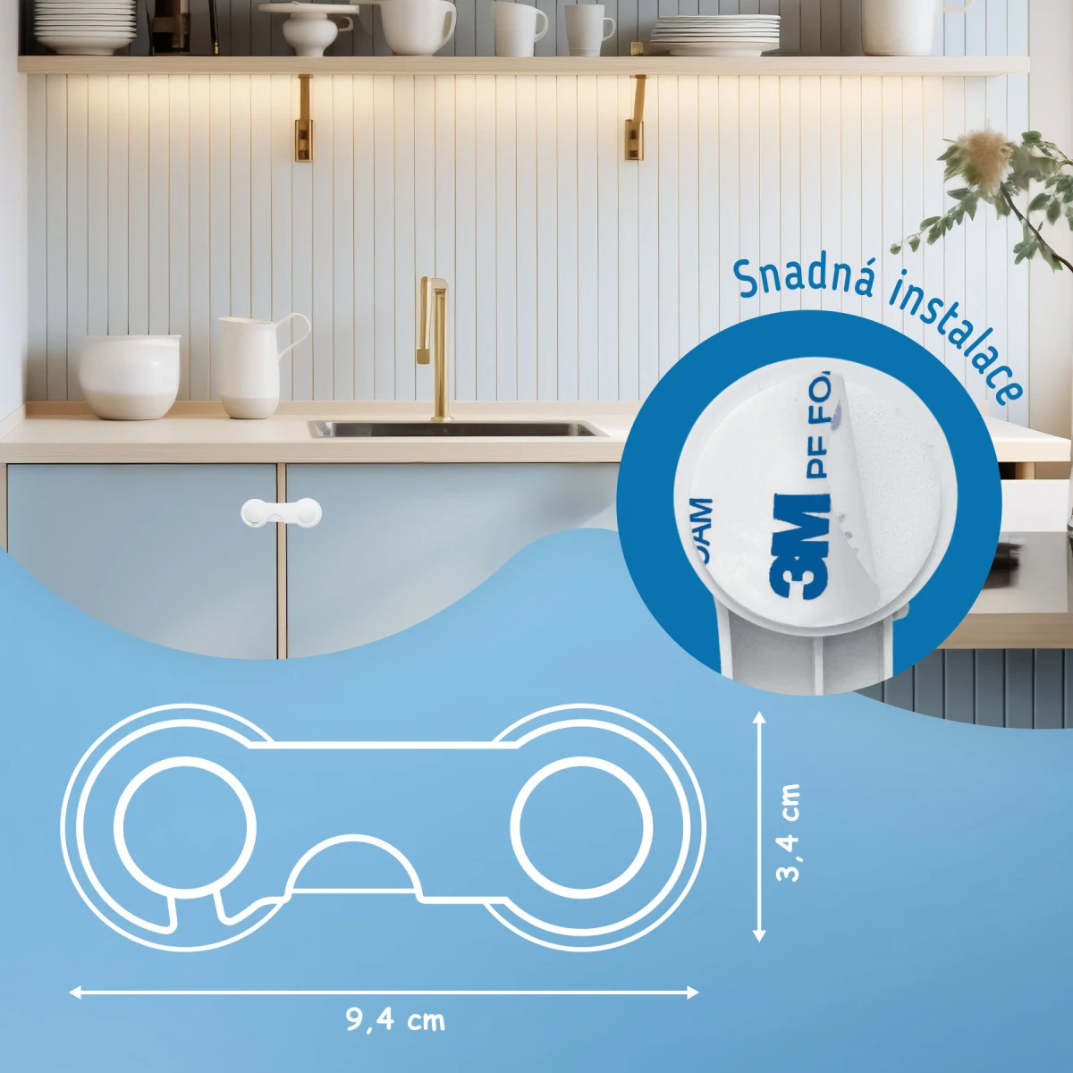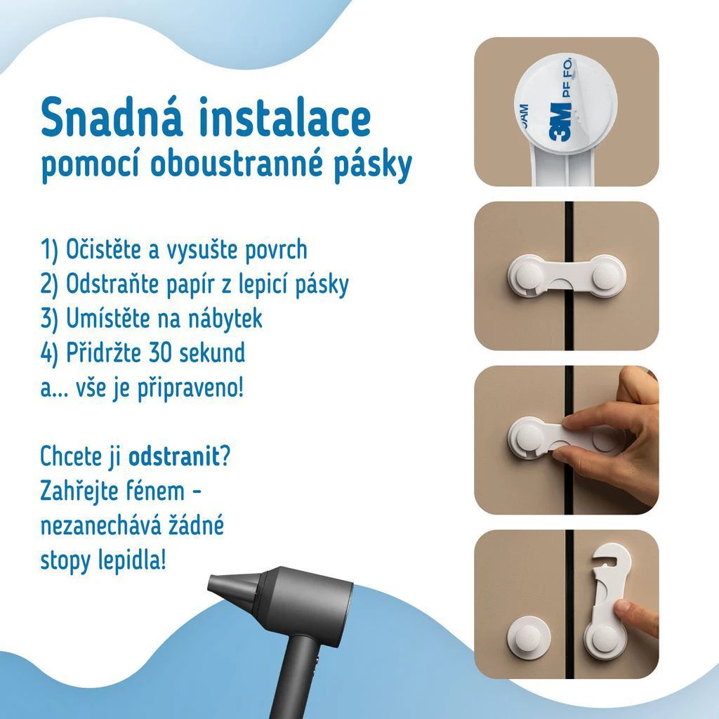 Použití je velmi jednoduché, zámek se pomocí oboustranné lepicí pásky přilepí k nábytku. Pro otevření jednoduše stisknete pojistný mechanismus na zámku. Pro vás bude obsluhování snadné, ale pro dítě bude obtížné zámek odemknout.