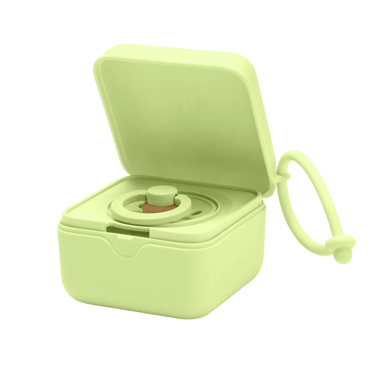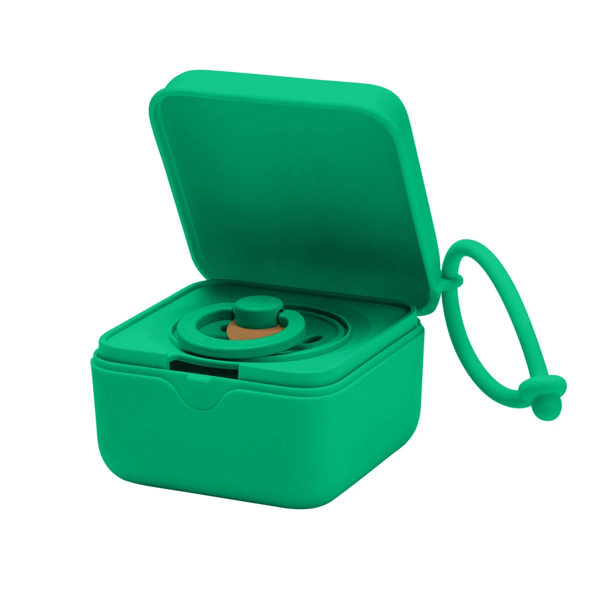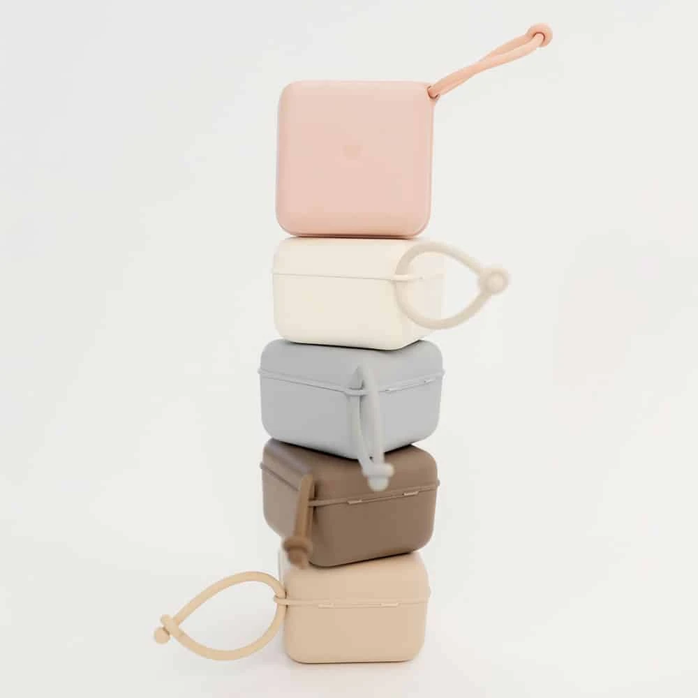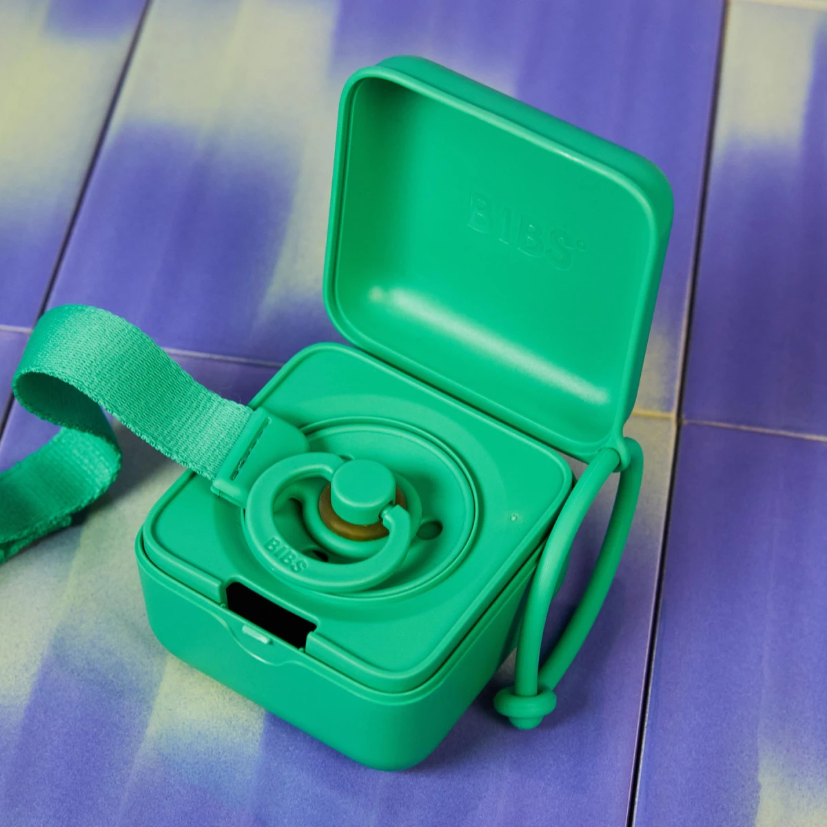 Díky silikonovému poutku lze krabičku snadno připevnit na tašku, kočárek, postýlku nebo autosedačku.