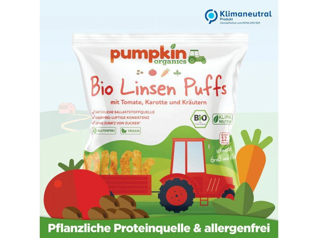 Jsou vyrobeny výhradně z organických ingrediencí a jsou speciálně navrženy tak, aby představily nové chutě a textury našim dětem jako součást nutriční cesty. Foukané, nesmažené a super křupavé. Vyrobené pro malá ústa a zoubky, pro snadné žvýkání a rozplývaní v ústech. Ideální pro učení samostatného stravování a pro pomoc při prořezávání zoubků. Přírodní chuť. Důležité upozornění: Podávejte pouze pod dohledem dospělé osoby. Nikdy nepodávejte vleže, aby nedošlo k zadušení. V Pumpkin Organics věříme, že to, čím naše nejmenší krmíme nejdříve, určuje, co budou rádi jíst později. Milují zeleninu jako malé, milují zeleninu jako velké. První kulinářské zážitky by proto měly být nejen chutné, ale především obsahovat opravdu kvalitní suroviny a málo (fruktózového) cukru. To je přesně to, co dělá naše produkty výjimečnými. Pokud podporujeme rozvoj chuti již při mlsání, podporujeme lásku k zelenině – podporujeme lásku k zelenině – a vytváříme si správné stravovací návyky hned od začátku. Skladování: Neotevřené balení skladujte při maximální teplotě do 25°C. V suchu a chraňte před světlem. Složení: Mletá čočka* 81%, slunečnicový olej* 8%, rajčatový prášek* 4%, mrkvový prášek* 4%, paprika*, cibulový prášek*, petržel*, koriandr*. *z kontrolovaného ekologického zemědělství Výživové hodnoty na 100g(4g): Energie 1728 kJ/411kcal (69kJ/16 kcal); Tuky 9,4g (0,4g) - z toho nasycené mastné kyseliny 1,1g (0,0g); Sacharidy 56g (2,2g) - z toho cukry 4,9g(0,2g)**; Vláknina 11g(0,4g); Bílkoviny 20g(0,8g); Sůl 0,22g(0,00g); Sodík 0,01g(0,00g). **Ingredience přirozeně obsahují cukr