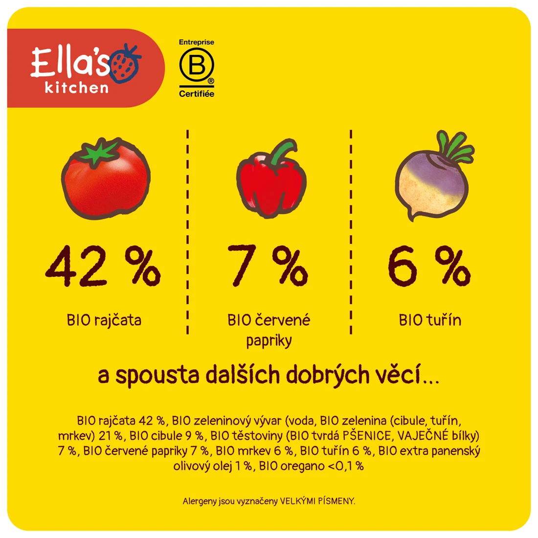 BIO rajčata 42 %, BIO zeleninový vývar (voda, BIO zelenina (cibule, tuřín, mrkev) 21 %, BIO cibule 9 %, BIO těstoviny (BIO tvrdá PŠENICE, VAJEČNÉ bílky) 7 %, BIO červené papriky 7 %, BIO mrkev 6 %, BIO tuřín 6 %, BIO extra panenský olivový olej 1 %, BIO oregano <0,1 %