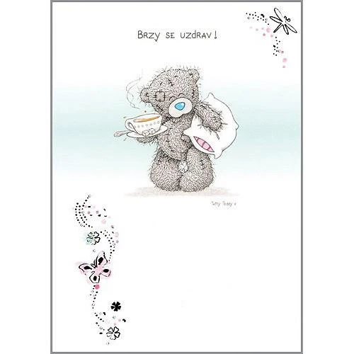 Přední strana blahopřání v jedinečném designu oblíbeného šedivého medvídka Me to You s modrým nosem.