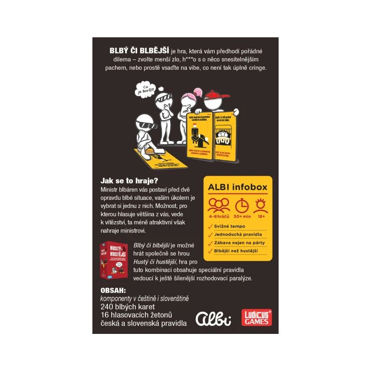 Blbý či blbější je nekorektní párty hra plná nečekaných dilemat, ve které vás možná překvapí, co všechno vaši spoluhráči považují za opravdu blbý.